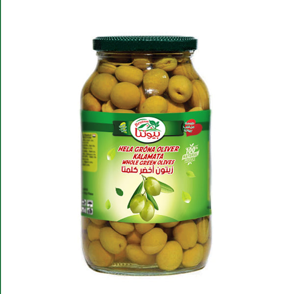 Gröna hela oliver 60 %, vatten 34 %, salt 5 %, surhetsreglerande medel E330 0,5 %, chili 0,3 %, citron 0,2 %