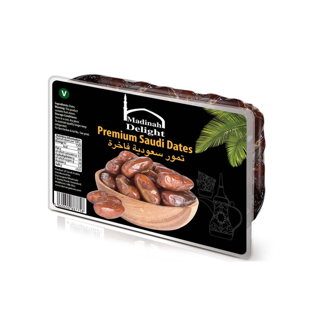 # Premium Saudiska Dadlar 450g Autentiska dadlar från Saudi-Arabien, noggrant utvalda för sin naturliga söta smak och näringsrika sammansättning. Dessa högkvalitativa dadlar är rika på fiber, kalium och antioxidanter, vilket gör dem till ett idealiskt val för hälsomedvetna konsumenter. Perfekta att äta direkt, blanda i smoothies eller använda som naturlig sötningsmedel i bakning. Förpackningen på 450g säkerställer fräschhet och bevarar dadlarnas naturliga kvaliteter. En klassisk mellanöstern-favorit som erbjuder autentisk smak och hälsofördelar i varje tugga.