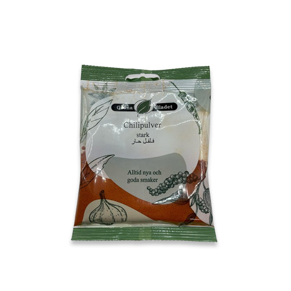 Gröna Bladet Chilipulver Stark 40g är restbeställd och skickas så fort den finns i lager igen.