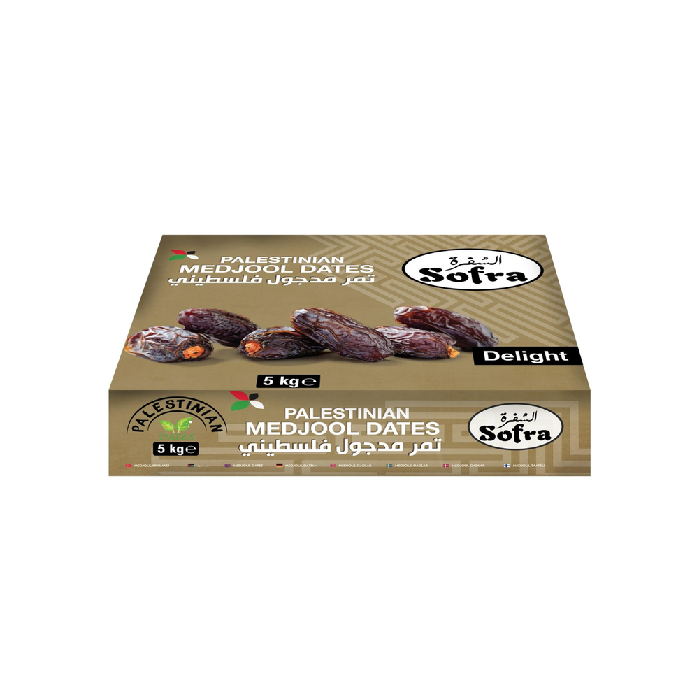 # Palestinian Medjool Delight 5KG Indulge in premium Medjool dates sourced from the heart of Palestine. These naturally sweet, soft-textured dates deliver rich caramel notes and exceptional quality in every bite. Perfect for snacking, baking, or gifting, our 5KG bulk offering ensures you have an abundant supply of this nutritious superfood. Medjool dates are packed with fiber, antioxidants, and natural energy—ideal for health-conscious consumers seeking authentic, ethically sourced ingredients. Experience the authentic taste of Palestinian heritage with every date.