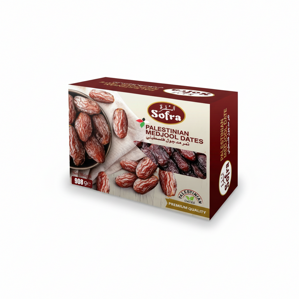 # Palestinian Medjool Premium 908g Indulge in the finest Medjool dates sourced from the Palestinian territories. These premium dates deliver exceptional sweetness and a luxuriously soft texture that distinguishes them from standard varieties. Rich in natural sugars, fiber, and essential minerals, Medjool dates make an ideal choice for health-conscious consumers seeking wholesome nutrition. Perfect for snacking, baking, or incorporating into smoothies and energy balls. Each 908g package ensures you have an ample supply of this versatile superfood. Experience the authentic taste of traditionally cultivated dates with every bite.